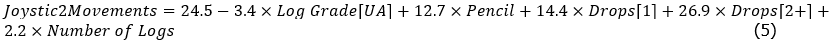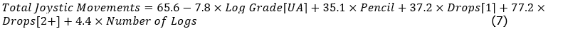 Eq. 5 shows the regression model for joystick2movements (crane up and down, grapple rotation) during a grab. Much like the previous two models pencilling, number of logs and dropping are consistently highly significant variables (p<0.001). However, joystick2 is significantly affected by the UA log grade, decreasing joystick movements by 3.4.