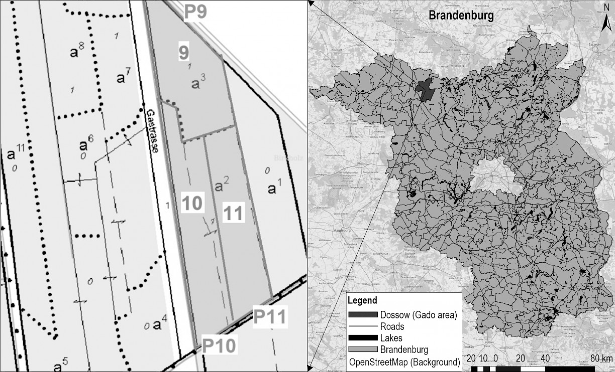 Fig. 1 Study area in Brandenburg, Germany, showing as an example for three plots (9, 10, 11) the dedicated landing site (P9, P10, P11)