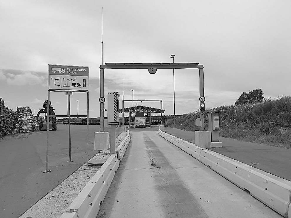 Opto-electronic devices (e.g., frame-based laser scanners such as RemaSawco RS-LogScanner3D, Microtec LogEye, or Jörg Elektronik JORO-3D) are commonly used at sawmills to measure individual logs following the debarking of stem wood. In contrast, industrial roundwood, for example, that which is destined for MDF or OSB, is typically measured in stacks at the forest roadside.