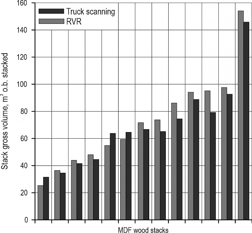 In this study, the volumes of wood stacks have been compared by the RVR and RVRprxis methods, as well as the FOVEA system for different assortments located in the northern part of Brandenburg, Germany. Our findings demonstrated that the use of RVR, RVRprxis, and FOVEA for the assortments resulted in no significant differences in volumes (Fig. 4).