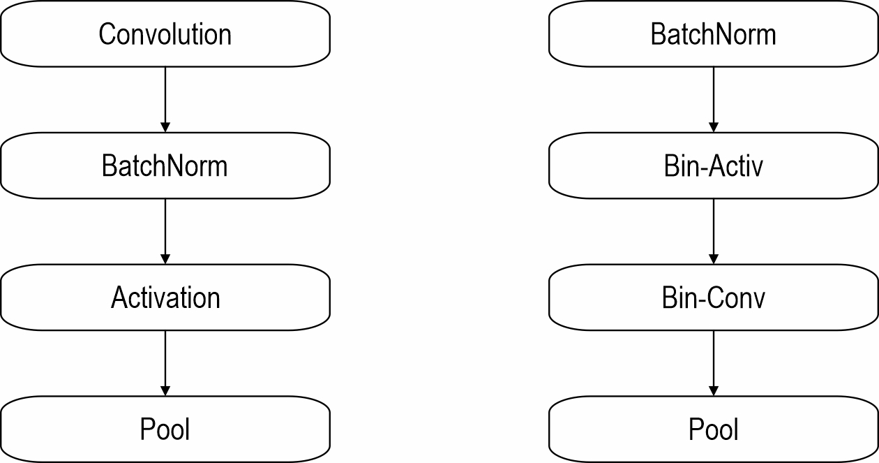 Fig. 3 Convolutional blocks in a CNN (left) and in a BNN (right). The execution order of the standard convolutional structure has been modified. Specifically, Batch Normalization (Batch Norm) and activation operations have been placed prior to the convolutional layer, with binarization applied to both the activation function and the convolutional layer