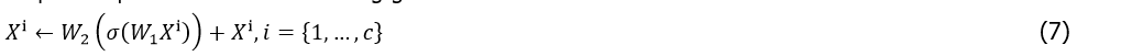 In our study, W1 and W2 are weights of the fully connected layers in MLP, while σ denotes the nonlinearity (ReLU). The inputs are connected back to generated projection via skip connections. This design helps the gradient flow and further improves its performance. For mixer forests, the overall capability of fully connected layers can be leveraged to automatically aggregate features, rather than just focus on local features, to achieve an effect similar to the attention mechanism. Instead of hierarchical (pyramidal) aggregation, the whole receptive field of the feature mixer means that each neuron sees the entire input image. A cascading block of mixer forests is used to incorporate spatial features into each feature map in iterative relationships.