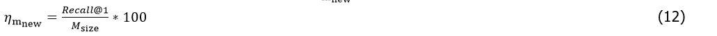Therefore, Memory Allocation Efficiency (MAE) is defined as the ratio of Recall@1 to model size: