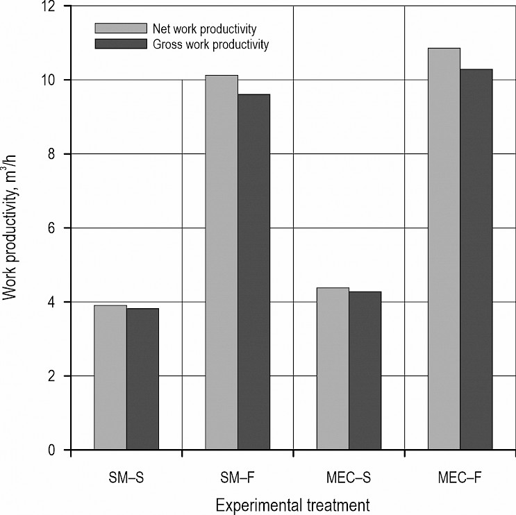 The analysis of the productivity of the overall felling operations showed that a higher mechanisation level led to higher work productivity, and that the highest productivity value was achieved when using the WTH in a mechanised way (Fig. 1). Specifically, gross work productivity for mechanised felling resulted 41% and 65% higher in comparison to semi-mechanised felling in the skidding and forwarding plots, respectively. Considering net work productivity, the increase when using mechanised felling was 44% and 66%, respectively, for skidding and forwarding plots.