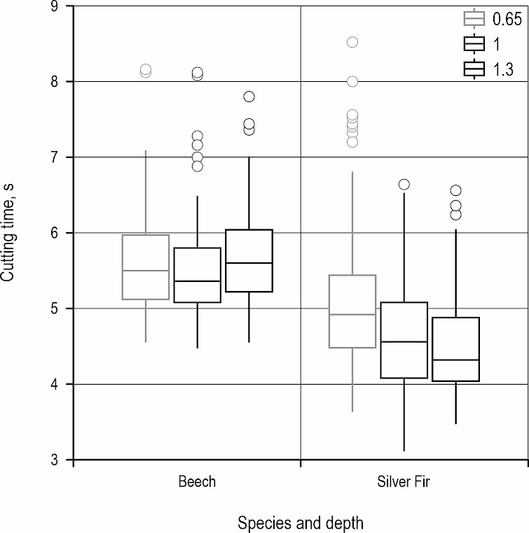 Considering all these premises, the aim of this study is to assess the expected variations of both the cutting efficiency and the operators’ vibration exposure at standard and higher depth gauge lowering levels in cross-cutting operations. Moreover, to consider the effects of wood density, the assessment was developed on two wood species (Fagus sylvatica L. and Abies alba Mill.) and, to consider the variability due to the operator, cross-cutting was carried out by four forest operators.