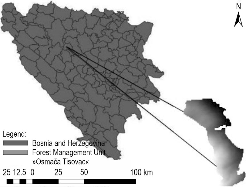 The road is located within the Forest Management Unit (FMU) »Osmača«, which covers a total area of 1338.22 ha. This FMU belongs to the Forest Management Area (FMA) »Čemernica« situated in the municipality of Kneževo, Bosnia and Herzegovina, and is managed by the Forest Administration (FA) »Čemernica« under the Public Forest Company (PFC) »Forests of Republic of Srpska« Ltd (Fig. 1).