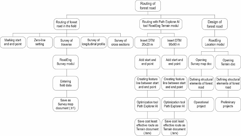 Forest road planning has long been recognized as a fundamental element of sustainable forest management, ensuring access to harvesting, transportation, fire prevention, pest control, and recreation, while at the same time minimizing ecological impacts (Sessions 2007, Begus and Pertlik 2017). Optimal density of forest road infrastructure is one of the fundamental preconditions for modern, high-quality, integrated, and rational forest ecosystem management (Bajrić et al. 2022). Traditional approaches relied heavily on field-based surveying, particularly the establishment of the so-called zero line, where the optimal alignment was approximated using dividers and clinometers on topographic maps (Stückelberger et al. 2006). Although such approaches remain important in practice, the increasing accuracy of digital terrain models (DTMs) and the availability of specialized design software have significantly transformed forest road design. Tools such as RoadEng, especially its Terrain and Location modules, have been widely adopted for their capacity to handle geometric design, earthwork calculations, and drainage structures.