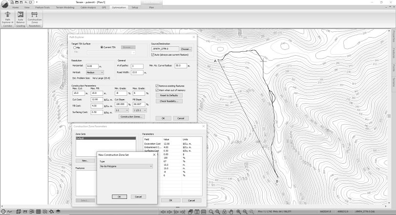 Path Explorer is an AI-driven corridor planning system that automatically generates and ranks alternative road alignments under user-defined geometric, environmental, and cost constraints. The outputs from Path Explorer will serve as a basis for further refinement and detailed road geometry design in the RoadEng Location module. The design process will begin with the preparation of spatial data (start and end points, DTMs/TINs), enabling terrain analysis and earthwork calculations. Designers will then define constraints and parameters such as road width, minimum curve radius, maximum and minimum grades, slope ratios for cut and fill, and unit costs for excavation, embankment, and surfacing. No-go zones or areas of high construction costs can also be specified.