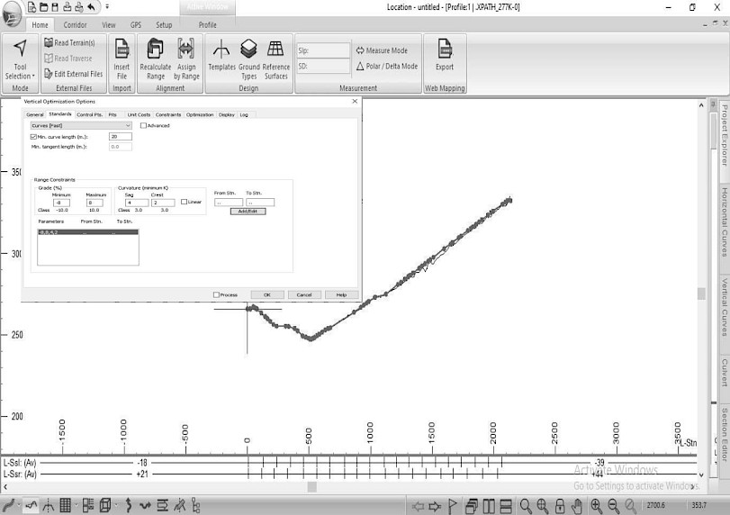 The least expensive Path Explorer AI-driven routes for DTM 20×20 m and DTM 90×90 m (.terx format), together with the field-based design (.tr1 file), were imported into the RoadEng Location module. In accordance with the »Manual for Forest Road Design in Republic of Srpska« (IRPC 2002), the constructive elements of the road were then defined in plan, profile, and cross-section views. The objective was to produce the operational project from field data and preliminary projects from AI-driven alignments. In the plan view, the definition of constructive elements began with setting horizontal curves, ensuring a minimum radius of 20 m. The »Location module« corrected both the field and AI-driven zero-lines to establish the optimal number of curves (Fig. 6). For the longitudinal profile, the »Vertical Optimization Options« were applied, setting limits for road grade and curve radii based on the national design manual (Fig. 7). Cross-sectional elements were defined using the »Low Resource Template«, specifying a 4 m road width (3 m carriageway and two 0.5 m shoulders), cut slope of 2:1 (200%), fill slope of 1:1.25 (80%), and a ditch 0.5 m wide and 0.2 m deep, with a 30 cm roadbed layer (Fig. 8).
