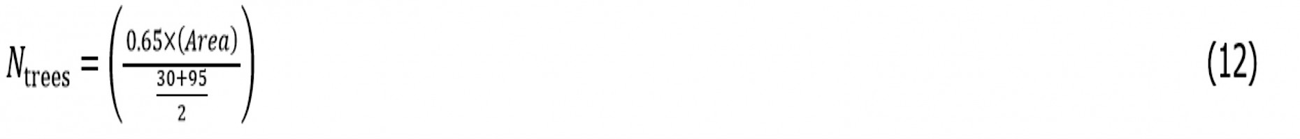 A prediction model for sound distribution in a needleleaf forest environment was developed using the model trained with an ANN. A test area was created in a virtual environment to predict the impact area of the sound distribution model. The sound distribution was presented in a forest area with a ground slope of 35% and 65% canopy cover in the test area. A height function was created for any ymax and ymin point (Eq. 10, 11). The 3D terrain graph was visualized using the relationship between the maximum and minimum values of the created function and the 0.65 canopy coefficient. It was carried out by randomly distributing the diameter distributions of conifer species within the forest, with values ranging from 25 cm to 35 cm, across the area. Additionally, it was assumed that the crown area of the trees could range from 30 to 95 m² in a circular shape. Number of trees (Ntrees) was calculated by dividing the total area (m2) by the average tree crown area (Eq. 12).