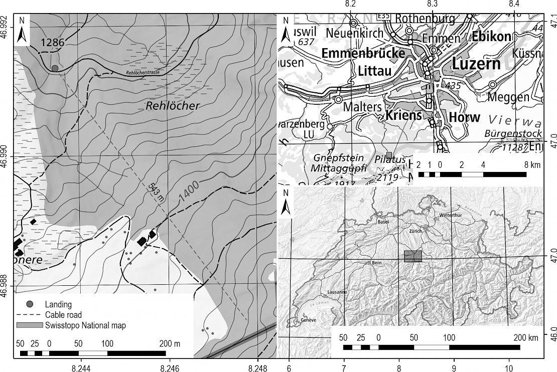 Fig. 1 Position and length of the cable road at the study site, overlaid on a topographic map (left); location of the study site in the Swiss canton of Lucerne (top, right); and location of the study site within Switzerland (bottom, right). Maps reproduced with permission from Swisstopo (JA100118). Coordinate system: EPSG 4326 – WGS 84