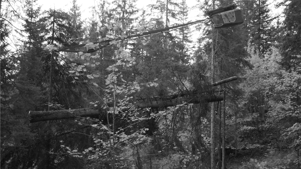Approximately 90% of the trees were located within a 5-m lateral yarding distance, while in two cases the distance was more than 10 m. Trees were typically felled with the thick end facing the skyline and the thin end positioned uphill at an angle of approx. 45°. The carriages stopped near the thick end, which was then attached to the chokers of carriage 1. The carriages continued moving uphill until the tree/load turned and was pulled below the skyline. At this point, the other end of the tree/piece was attached to the chokers of carriage 2 and then lifted, and the entire system was sent downhill to the yarder. Fig. 5 shows the carriage in use. In some cases, trees had to be felled downhill. In those cases, the procedure remained the same: first, the thick end was pulled uphill until the tree turned, and then the other end was attached to the second carriage and lifted.