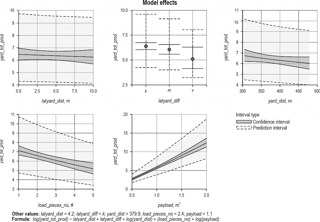 Coefficient estimates and the significance of the corresponding predictors were nearly the same for productive yarding time as for the total yarding time, with the exception that log(yard_dist) was only significant at the 5% level in the model for productive yarding time. Model 5 with AIC (Table 6) is recommended for predictive use because it excluded the redundant variable latyard_dist without compromising on performance indices relative to the other models, and because it included load_pieces_no, which is favoured over avg_piece_volume. Model effect plots are similar to Fig. 6 and hence omitted.