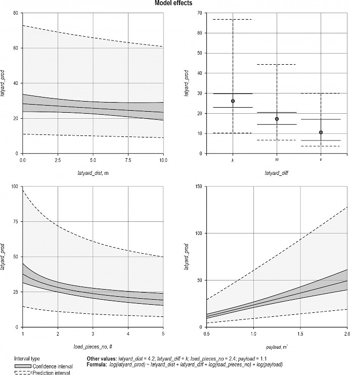 Fig. 7 displays the model effect plot for model 8. Lateral yarding productivity was estimated to drastically decrease as lateral yarding difficulty increased. Increasing the payload or decreasing the number of trees/pieces were also estimated to improve productivity, while the flat line for latyard_dist indicates its predicted lack of effect.