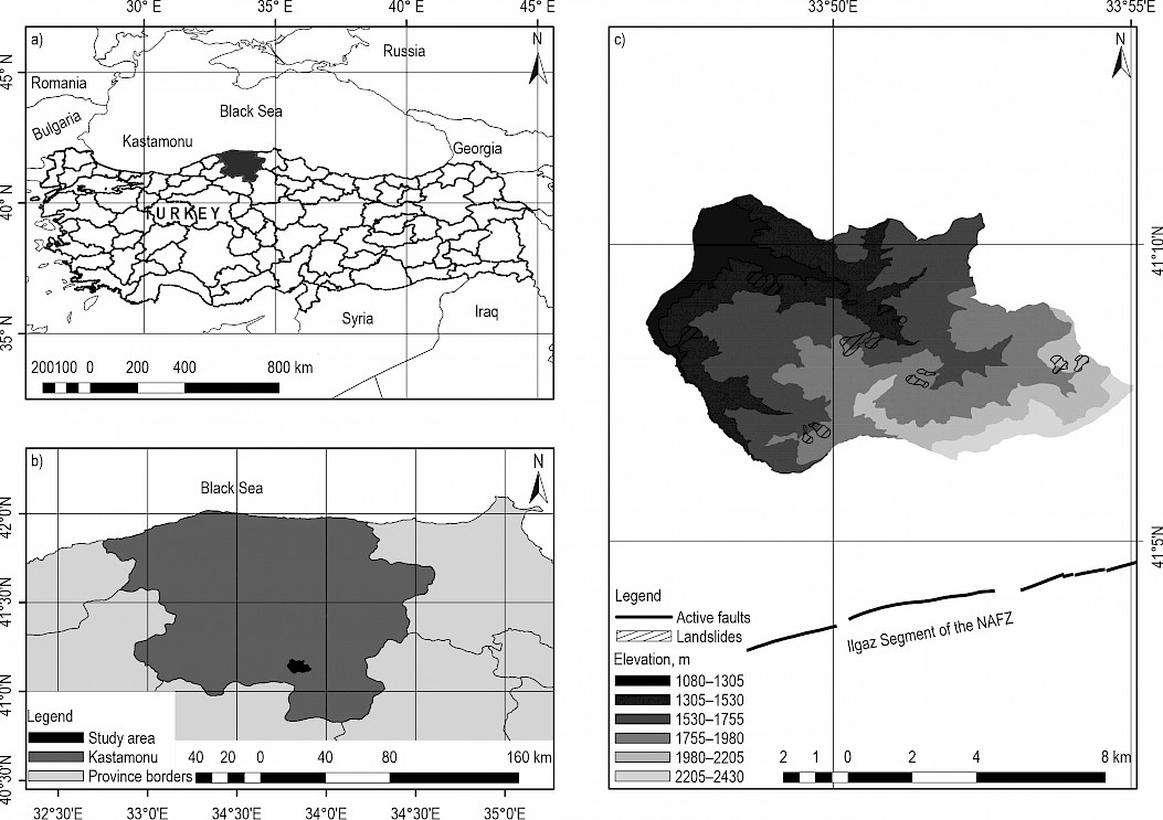 Fig. 1 Map of the study area: a) location of Kastamonu in Türkiye, b) neighbouring provinces of Kastamonu and c) study area