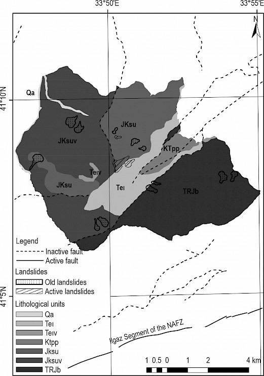 There are seven lithological units in the study area (Fig 2). The Triassic-Liassic Bekirli Formation (TRJb), consisting of sedimentary fill; schist; gneiss; and blocks of limestone, marble, metaserpentine, metadiorite, metagabbro and metaquartzite, is the oldest unit in the study area. The Upper Jurassic-Lower Cretaceous Susuz Formation (JKsu) comprises sandstone, siltstone, claystone, sandy-clayey limestone and volcanic rocks (diorite, andesite, diabase and tuff). The Early Cretaceous-Turonian Volcanic Member (JKsuv) of the Susuz Formation, appearing as intercalated contributions, primarily consists of volcanic rocks. The dominant rocks in this unit are andesite, basalt, diabase, dacite, spilite and tuff, along with granodiorite, diorite, dacite and diabase dykes cutting through these formations. The Maastrichtian-Palaeocene Pervanekaya Formation (KTpp) comprises conglomerate, gravelly sandstone, sandy limestone and limestone. The Lutetian Ilıca Formation (Teı) comprises conglomerate, sandstone, sandy limestone, limestone and volcanic rocks. The Lutetian Akyörük Volcanic Member (Teıv) comprises basalt-andesite, tuff and agglomerates. Quaternary alluvium (Qa), represented by river and floodplain sediments, comprises gravel, sand and silt-clay deposits (Sevin and Uğuz 2011).