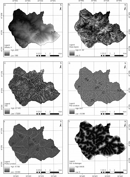 Fig. 3 Conditioning factor maps: a) altitude, b) slope, c) topographic wetness index (TWI), d) plan curvature, e) profile curvature and f) distance to drainage