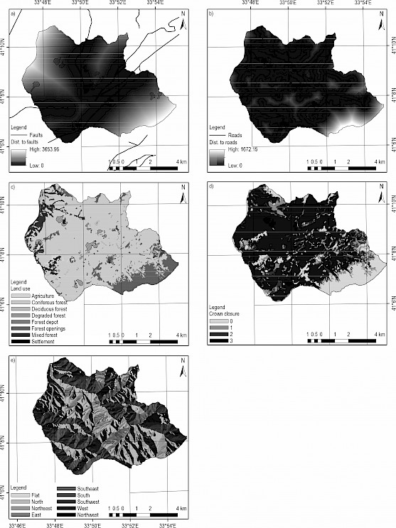 Fig. 4 Conditioning factor maps: a) distance to faults, b) distance to roads, c) land use, d) crown closure and e) aspect