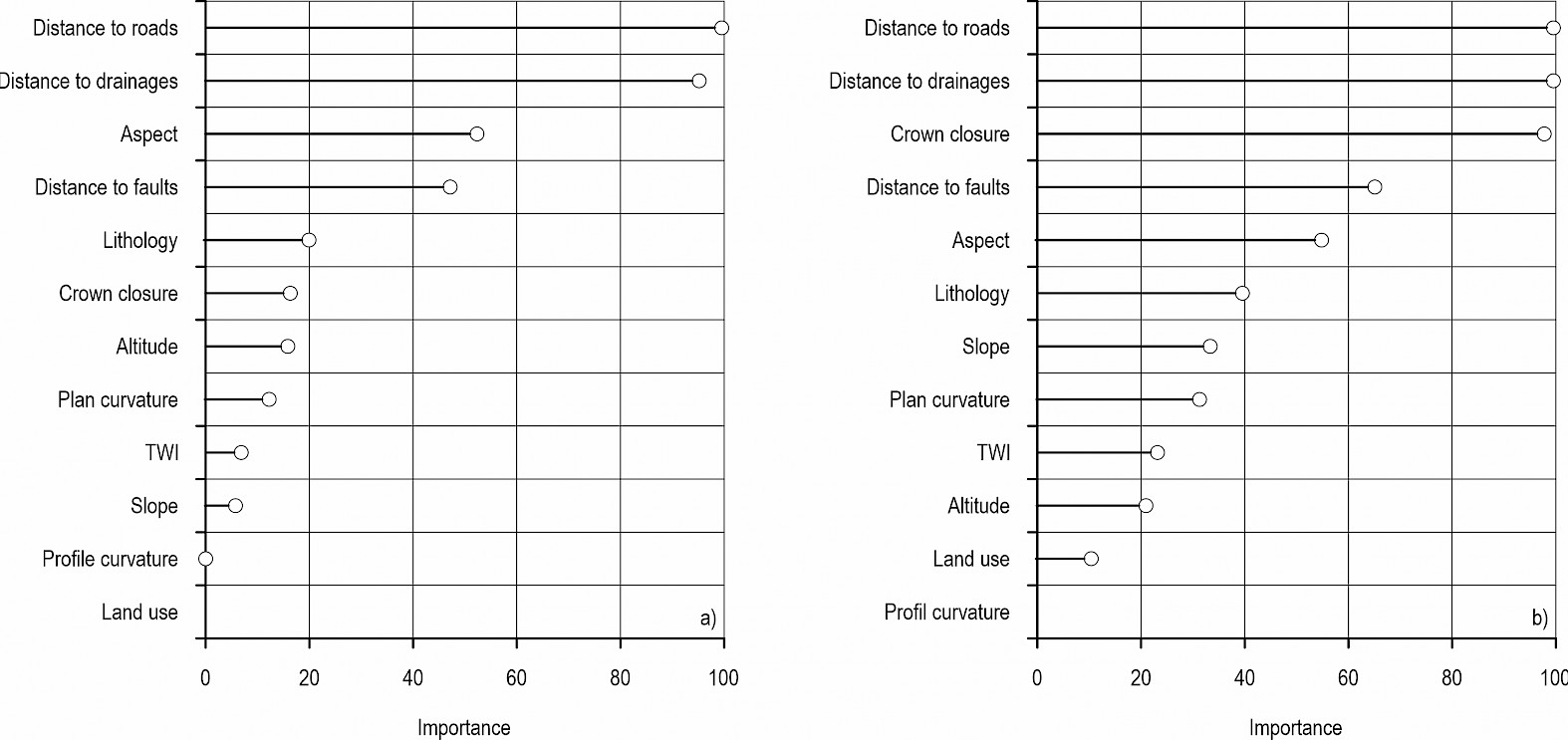 Given that landslides cause economic losses and loss of life, susceptibility studies aimed at reducing landslide damage and informing land use planning are crucial. Landslide susceptibility maps (LSM), which are critical for preventing or mitigating landslide damage, show the distribution and likelihood of areas prone to landslides after identifying the factors causing these events and by representing past landslide occurrences in an inventory. This is achieved through various analyses (Raja et al. 2017, Bugday and Akay 2019). Geographic information system (GIS) technologies are widely used for storing large amounts of data, evaluating it through statistical analyses and applying machine learning (ML) and artificial intelligence methods in landslide susceptibility analysis (Aleotti and Chowdhury 1999, Dikshit et al. 2020). To produce LSMs, statistical methods, such as frequency ratio (FR), and ML techniques, such as logistic regression (LR) and artificial neural networks (ANN), are widely used because of their effectiveness. In this context, numerous studies have evaluated ML methods for producing LSMs and assessing forest roads affected by landslides based on various factors. Sur et al. (2021) determined the areas with higher landslide susceptibility using the ensemble model of GIS-based multi-criteria decision making through fuzzy landslide numerical risk factor model along the Kalsi-Chakrata road corridor of Uttarakhand. Eker and Aydın (2014) created a landslide susceptibility map considering eight factors identified for their study area. The produced map was then overlaid with the road network map of the area to evaluate the conditions of forest roads in terms of landslide risk. Ghorbanzadeh et al. (2020), Kavzoglu et al. (2019), Arabameri et al. (2020), Shahabi et al. (2015) and Thanh et al. (2020) conducted landslide susceptibility analyses using ML methods to create LSMs. Mumcu Kucuker (2024) conducted a study in which landslide susceptibility analyses and maps were produced using ArcGIS software, and landslide-prone forest roads were identified using the analytical hierarchy process (AHP). Pham et al. (2016) used various ML techniques (support vector machine [SVM], LR, Fisher's linear discriminant analysis, Bayesian network and naive Bayes) to assess landslide susceptibility in 930 landslide areas. Wang et al. (2016) proposed a landslide prediction model using LR, FR, decision trees, weights of evidence (WoE) and ANNs. Chen et al. (2018) proposed a landslide vulnerability model using the random forest (RF) algorithm based on digital elevation models and Landsat 8 data. Xiao et al. (2020) proposed a landslide vulnerability model using hybrid models that combine RF, FR, the certainty factor and the index of entropy (IOE).