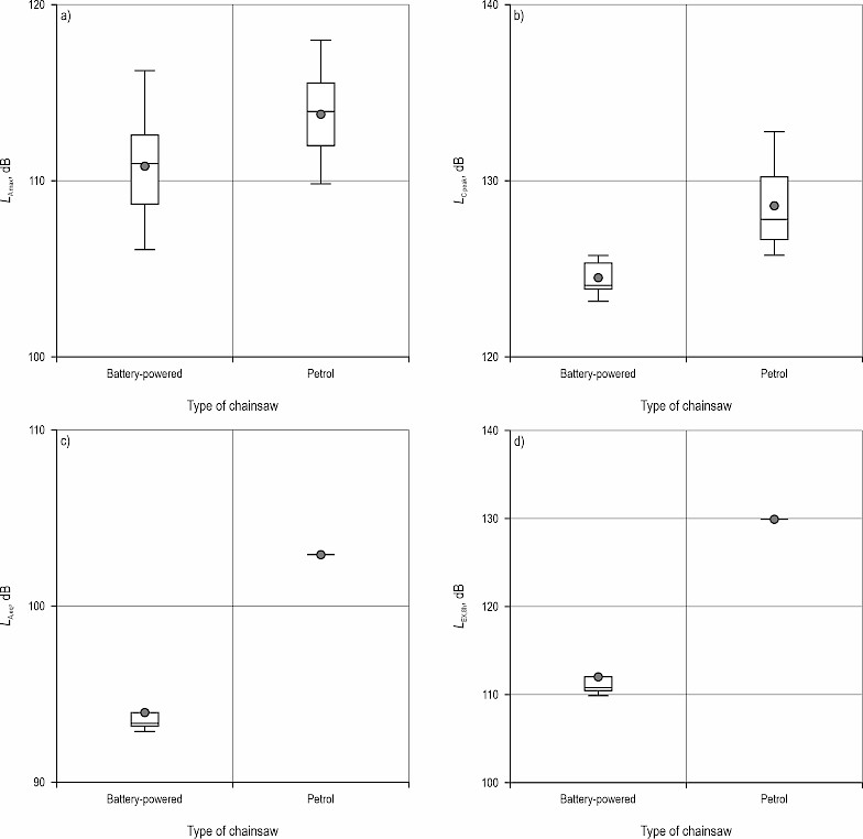 In general, all collected noise parameters were higher when a petrol chainsaw was used. The analysis of recorded factors showed that in the case of LA max (A-weighted maximum sound pressure level), the highest readings were obtained when a petrol chainsaw was used – approximately 114 dB, against approx. 111 dB for the battery-powered chainsaw. This is consequently 34 dB and 31 dB above safety noise level, although the differences obtained between tested chainsaws were not statistically significant (p>0.05). In the case of peak sound pressure level (LC peak), higher values were again observed during the trials in which forest workers used the petrol chainsaws. The highest value emitted by the petrol chainsaw was almost 133 dB, 7 dB higher than the highest peak obtained while using the battery-powered chainsaw (126 dB). The calculated differences between the peak results were statistically significant (p<0.05). Weighted equivalent continuous sound pressure level (LA,eq) was significantly lower (p<0.05) – 94 dB when the forest worker used the battery-powered chainsaw, and when using a petrol chainsaw, it was 103 dB. The difference between the average results was approx. 9 dB. In the case of noise exposure level per 8 h working day (LEX,8h), a higher exposure was recorded – 130 dB when a petrol chainsaw was used, in the case of a battery-powered device, it was 112 dB. The greatest difference between averages was obtained for this parameter – approximately 18 dB (Fig. 3).