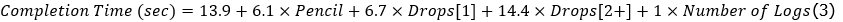 A grab completion time equation (Eq. 3) showed the significant factors influencing completion time. The number of logs, pencilling and dropping were found to be highly significant factors (p<0.001), as expected, due to the extra required movements needed to execute a drop and a pencil. The model shows that for every log in the grab, total completion time increases by that same amount. Notably, the time of day had no significant impact on the completion time. This shows that the operator performs consistently throughout the day.