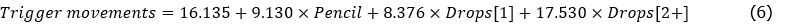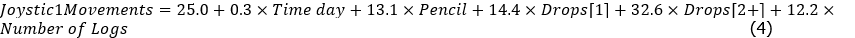Eq. 7 shows the regression model for the combined joystick and trigger movements. As expected, number of logs, pencilling and dropping are again highly significant variables increasing the number of movements by approximately 114 movements. The UA log grade was also found to be significant reducing the number of movements by 7.8.