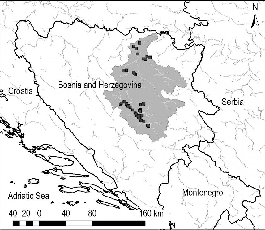 Fig. 1 Study area. Bosnia and Herzegovina (boundary) and Bosna River basin (grey) with temporary sample plots (dark grey)