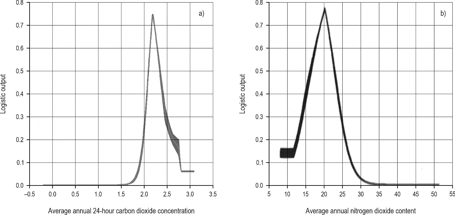 In the present study, the average annual sum of precipitation and the average annual 24-hour CO2 concentration were determined as environmental variables with the highest contribution to the model obtained. It is characteristic that the average annual sum of precipitation outperforms the impact of other climatic and hydrological variables in the model. The average annual sum of precipitation, in addition to the average water level, appears as limiting determinant for framing species ecological niche. It seems that the average annual sum of precipitation up to 1400 mm and the average water level between 20 cm and 200 cm provide sufficient water supply needed for species existence. Many studies reported that annual precipitation must be high if other climatic (dry and warm periods in summer) and hydrological impacts (water flow) influence water deficit (Claessens et al. 2010, Rutkowski et al. 2019). It seems that the determined range of the average annual sum of precipitation is satisfactory for high probability of species occurrence compensating for other insufficient sources of water supply. Related to the contribution of other determinants to the model, two air quality variables - the average annual 24-hour CO2 concentration and the average annual nitrogen dioxide - participated with about 25%. In this regard, studies have shown that black alder removes air pollutants (SO2, NOX, dust particles) improving air quality (Vogel et al. 1997, Temperton et al. 2003). Some studies reported that nitrogen-fixing trees, with increasing atmospheric CO2, increase both C assimilation and total N2 fixation, and can take advantage of extra assimilated carbon by increasing growth, biomass production and photosynthesis (Mousseau and Saugier 1992, Kimball et al. 1993, Vogel et al. 1997, Temperton et al. 2003) without potential nitrogen limitation (Temperton et al. 2003). We included air quality variables relevant to the populated Bosna River basin and noted that black alder appears with high probability in areas with high concentrations of maximum CO2 corresponding to low NO2 concentrations. This confirms the known ability of black alder to grow in industrial areas, near mines and polluted environments.