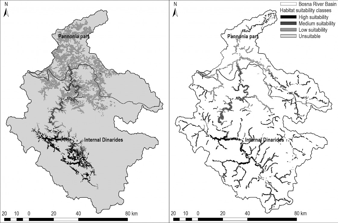 Terrestrial observations revealed that black alder stands are not spatially concentrated as a unique forest type but appear as patches, fragments, or smaller groups of trees. Predicted suitable habitats overlaid pedunculated oak and hornbeam (50%), Illyrian sub-mountainous beech (24%), sessile oak and hornbeam (10%) and other forests (16%). Similarly, Vukelić et al. (2010) discussed sessile oak horizontal redistribution with vertical ecological niche stratification in the western part of south-eastern Europe, which would be challenging for the remaining black alder sites. A promising perspective for black alder presence in a wider area was identified in the case study of the transboundary biosphere reserve Mura-Drava-Danube (Sallmannshofer et al. 2021). The authors predicted an increase in black alder distribution under expected climate and hydrological changes, indicating the ability of black alder to adapt and expand. Those findings are promising for black alder sustainability in the Bosna River basin but the actual small spatial extent as well as modeled suitable habitats call for forest and conservation management.