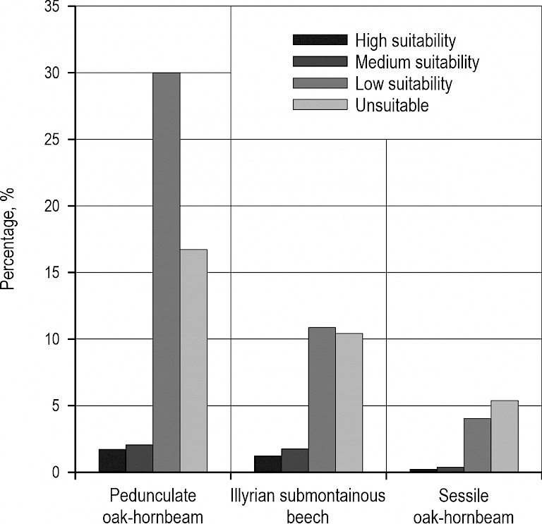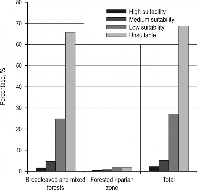 The probabilities of forest tree species occurrence under current and future environmental conditions have been used to classify habitat suitability in many studies (Çoban et al. 2020, Jha and Jha 2021, Liu et al. 2022, Chi et al. 2023). According to the results of the present study, the habitat suitability classes cover 67.7% (unsuitable), 25.8% (low suitability), 4.7% (moderate suitability) and 1.9% (high suitability) of forested areas including riparian zones. Moderately and highly suitable areas occupy approximately 7% of the forested area, which is similar to the conditions present on temporary plots. This indicates a low occurrence of black alder in the investigated area as well as limited environmental conditions for its spatial distribution. However, recent research has highlighted the drivers of potential changes in preferred habitats of Alnus species (Yang et al. 2025, Martin et al. 2024). Yang et al. (2025) predicted range shifts for five Alnus species under future climate scenarios, indicating species-specific responses. The authors predicted expansion toward higher latitudes and elevations for three species (A. cremastogyne, A. mandshurica, and A. hirsuta), and habitat contraction for one species (A. ferdinandi-coburgii). Martin et al. (2024) reported on the distribution, diversity, and genetic structure of Alnus species (A. glutinosa and A. lusitanica) in Spain, emphasizing that these structures are still largely unknown in the Mediterranean basin. The authors highlighted the need to investigate Alnus genetic differentiation, particularly as the recently discovered tetraploid A. lusitanica has shown tolerance to global warming conditions (Gomes Marques et al. 2022). Populations of tetraploid Alnus identified in the northern part of the Bosna River basin are currently located in habitats with low suitability for A. glutinosa. These edge populations could potentially serve as a reservoir of reproductive material for more widespread Alnus species within the Bosna River basin. A similar potential exists for Alnus hybrids located along tributaries in the central part of the Bosna River basin (Bašić et al. 2014).