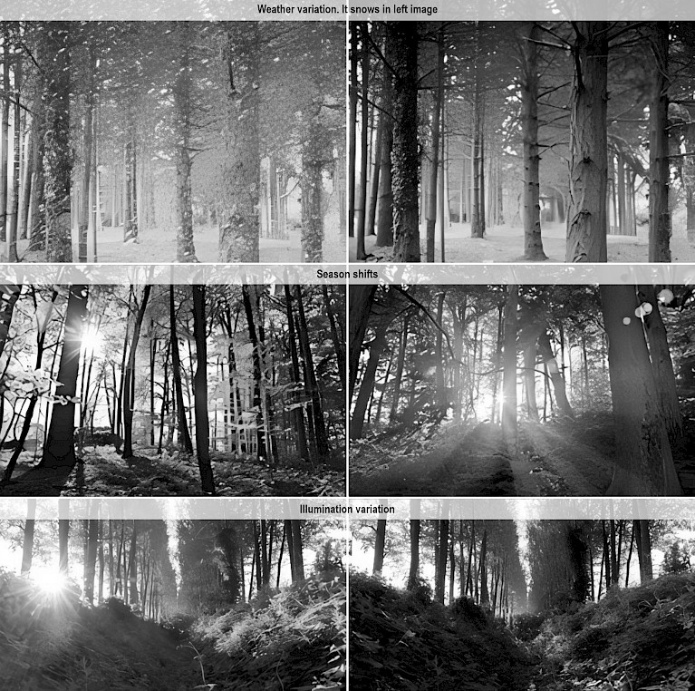 Fig. 1 The same place in forest shows different appearance due to weather, season, and illumination variations
