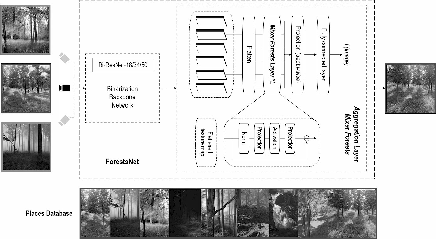 - ForestsNet was constructed for VPR, primarily consisting of a binarized backbone network and the Mixer Forests module. For the binarized backbone network, Leaky Sign and DoReFaNet were applied to binarized activation and weight function. Mixer Forests aggregate features from the binarized backbone to generate robust forest image representations. Experiments showed that ForestsNet achieves higher Recall than current typical aggregation methods and superior comprehensive performance compared to prevailing BNNs .