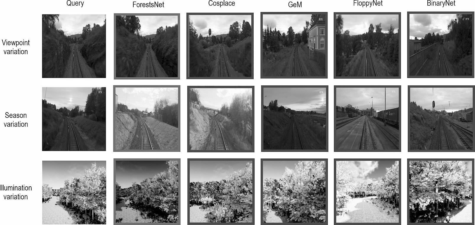 Fig. 4 gives some image examples that highlight significant challenges, including variations in viewpoint, season, and illumination. The 1st column gives the images captured to query, and columns 2–6 present the retrieval results from five different methods, respectively. It can be seen that ForestsNet successfully retrieved all correct images, while other methods either retrieved similar images from different locations or identified places that were geographically close but still below the threshold, thus failing to retrieve all the correct results. Thus, this experiment demonstrated the superior performance of ForestsNet in forest environments, and showed strong robustness against these challenges.