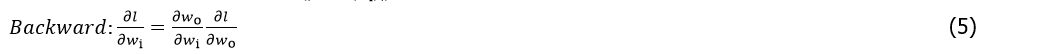 Thus, Eq. (1) constrains weights to [0, 1]. An affine transformation is then used to adjust to [–1, 1]. Eq. (5) is the backpropagation with respect to DoReFaNet, the partial derivatives with respect to wo and wi, and l is the loss function.