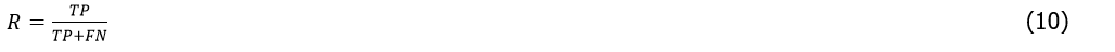 Recall (also known as true positive rate) can be used to evaluate the robustness of VPR against environmental changes (e.g., seasons, weather, lighting, etc.). Its formula is as follows: