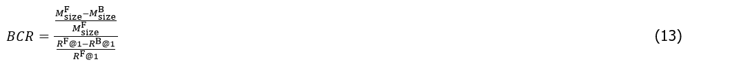 Existing metrics for quantitative effect of model binarization suffer from fragmented evaluation: model compression ratios measure memory savings, while accuracy loss quantifies performance degradation. To holistically assess binarization effect, the Balance Compression and Recall (BCR) metric was proposed, as shown in Eq. (13). It defines binarization effect by the proportion of model size reduction and the proportion of recall reduction.