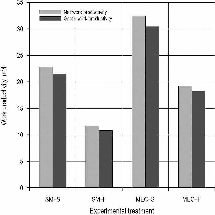 The analysis of the productivity of the overall felling operations showed that a higher mechanisation level led to higher work productivity, and that the highest productivity value was achieved when using the WTH in a mechanised way (Fig. 1). Specifically, gross work productivity for mechanised felling resulted 41% and 65% higher in comparison to semi-mechanised felling in the skidding and forwarding plots, respectively. Considering net work productivity, the increase when using mechanised felling was 44% and 66%, respectively, for skidding and forwarding plots.