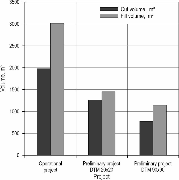 The Operational Project records the highest earthwork volumes, with cut: 1978.90 m³ and fill: 3012.10 m³. In comparison, the Preliminary Projects demonstrate a substantial reduction in excavation and filling requirements. This is most evident in the DTM 90x90 m project, which achieves the lowest earthwork demand (cut: 776.50 m³; fill: 1143.50 m³). These findings suggest that preliminary designs, especially with coarser digital terrain models, may provide more efficient earthwork solutions, minimizing both material movement and construction costs, while still maintaining acceptable geometric standards (Table 3 and Fig. 13). The quality of DTMs is essential for subsequent timber skidding planning, as using different input data can result in a completely different skidding trail, depending on the extent of the obstacles (Hrůza et al. 2025). Grade of longitudinal profile of the forest roads ranges from 3.18 to 3.63% (Table 1). These values indicate that all analyzed alignments meet the prescribed design standards, with minimal variation in gradient between the operational and AI-driven projects. Prior applications of RoadEng and related optimization logic show similar cost drivers: when horizontal/vertical geometry is tuned within policy constraints, reductions in cut/fill volumes dominate total cost reductions (Heralt 2002, Sessions 2007). At the same time, the caution from DEM/DTM-accuracy studies remains pertinent: smaller apparent volumes on coarse DTMs can reflect terrain smoothing rather than genuine constructability gains, which is why high-density LiDAR or carefully validated photogrammetric DTMs are recommended for operational-level estimation (Matinnia et al. 2018, Kardoš et al. 2024, Lovrinčević et al. 2025).