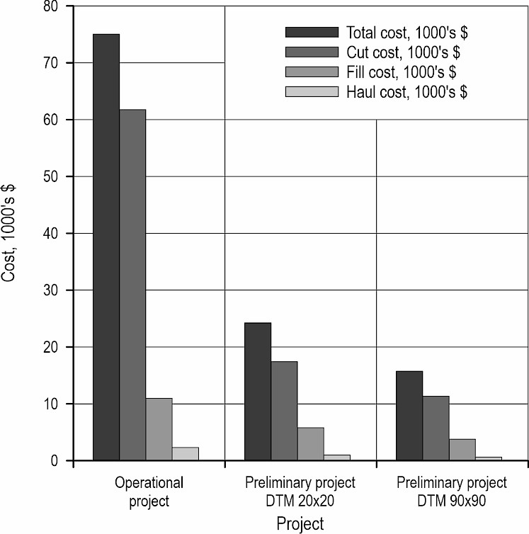 The Operational Project proved to be by far the most expensive, with a total cost of 75,040 USD. In contrast, the Preliminary Projects substantially reduced construction costs, with the DTM 90×90 m alternative achieving the lowest total cost of 15,750 USD. Most of the expenses were attributed to cutting operations, with the Operational Project recording the highest cut cost (61,750 USD) and fill cost (10,980 USD). Both Preliminary Projects significantly lowered these values, with the DTM 90×90 m variant emerging as the most efficient option. Haul costs were relatively minor compared to cut and fill operations, with the lowest value observed in the DTM 90×90 m project (610 USD) (Table 4, Fig. 14). Comparing the least-expensive Path Explorer routes to the corresponding preliminary projects, total costs fell by 5750 USD (19.2%) for the 20×20 m DTM and 11,250 USD (41.7%) for the 90×90 m DTM after full definition in the Location module. Similar to this is the two-step improvement:
