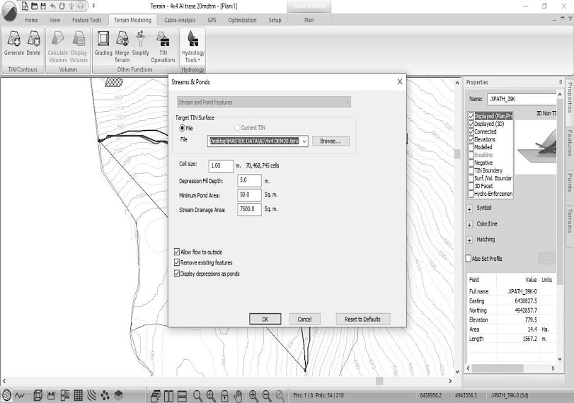 In the design process, »Construction Zones« will be defined to exclude sensitive areas such as sinkholes (Fig. 3), while »Hydrology Tools« will delineate streams and water accumulation zones (Fig. 4). From the three generated alternatives, the least expensive AI-based route will be selected and saved in .terx format for comparison with the field-designed zero line. The operational project will establish the zero line through grade measurements, traverses, and curve calculations, followed by recording longitudinal profiles and cross-sections. All collected data will then be processed in the RoadEng Survey module (Fig. 5) and exported for detailed design.