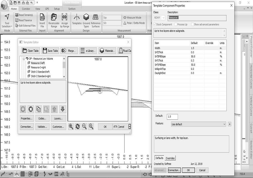 The least expensive Path Explorer AI-driven routes for DTM 20×20 m and DTM 90×90 m (.terx format), together with the field-based design (.tr1 file), were imported into the RoadEng Location module. In accordance with the »Manual for Forest Road Design in Republic of Srpska« (IRPC 2002), the constructive elements of the road were then defined in plan, profile, and cross-section views. The objective was to produce the operational project from field data and preliminary projects from AI-driven alignments. In the plan view, the definition of constructive elements began with setting horizontal curves, ensuring a minimum radius of 20 m. The »Location module« corrected both the field and AI-driven zero-lines to establish the optimal number of curves (Fig. 6). For the longitudinal profile, the »Vertical Optimization Options« were applied, setting limits for road grade and curve radii based on the national design manual (Fig. 7). Cross-sectional elements were defined using the »Low Resource Template«, specifying a 4 m road width (3 m carriageway and two 0.5 m shoulders), cut slope of 2:1 (200%), fill slope of 1:1.25 (80%), and a ditch 0.5 m wide and 0.2 m deep, with a 30 cm roadbed layer (Fig. 8).