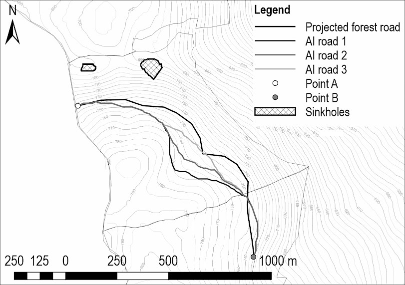 Forest road planning has long been recognized as a fundamental element of sustainable forest management, ensuring access to harvesting, transportation, fire prevention, pest control, and recreation, while at the same time minimizing ecological impacts (Sessions 2007, Begus and Pertlik 2017). Optimal density of forest road infrastructure is one of the fundamental preconditions for modern, high-quality, integrated, and rational forest ecosystem management (Bajrić et al. 2022). Traditional approaches relied heavily on field-based surveying, particularly the establishment of the so-called zero line, where the optimal alignment was approximated using dividers and clinometers on topographic maps (Stückelberger et al. 2006). Although such approaches remain important in practice, the increasing accuracy of digital terrain models (DTMs) and the availability of specialized design software have significantly transformed forest road design. Tools such as RoadEng, especially its Terrain and Location modules, have been widely adopted for their capacity to handle geometric design, earthwork calculations, and drainage structures.