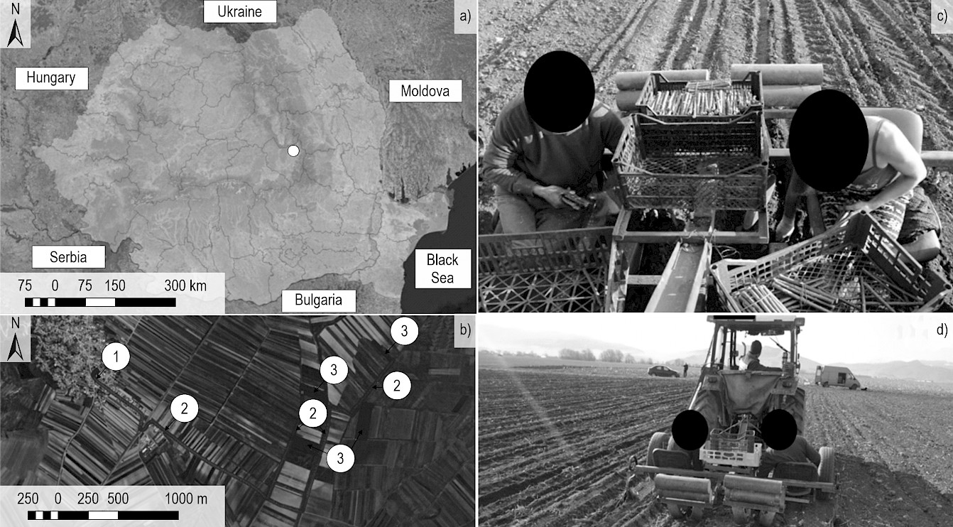 Fig. 1 Study location: (a) location of the study area at the national level, (b) examples of GPS locations collected at the work preparation facility (1), during relocations (2) and during planting (3), (c) an example showing the planting procedure; (d) a general view on the planting equipment. Note: the maps from (a) and (b) were created in the open source (QGIS software 2023) by using freely available vector datasets of the country and the open access Bing aerial data as of October 10, 2023, loaded by the functionalities of QGIS