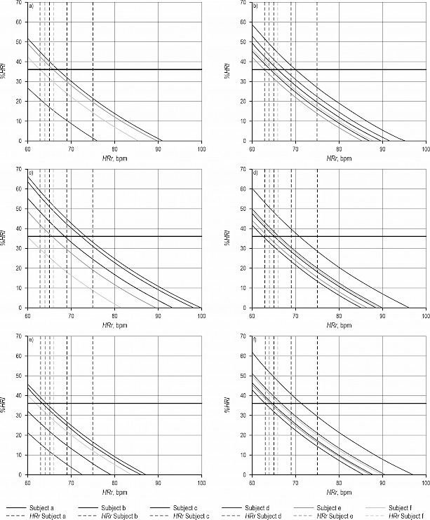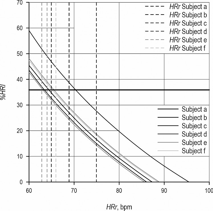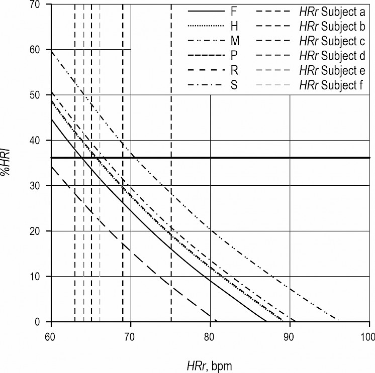 The subject-based heart rate increment is shown in Fig. 4 by keeping the same mode of data visualization. Excluding the subject c, which stands apart by a %HRI curve pointing a higher cardiovascular workload when assuming a range of 60 to 70 bpm for the HRr, the rest of the data was rather grouped, indicating similar trends irrespective of the subject under consideration. At the subject level, and based on the minimum values of the heart rate extracted from the data, the work was categorized as being of low to moderate intensity.