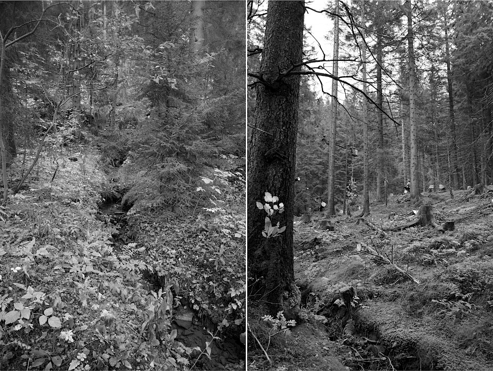 Two forest types are present in the study site: horsetail-spruce-fir (Equiseto-Abieti-Piceetum typicum) and tall herb-spruce-fir forests (Adenostylo-Abieti-Piceetum). The former is a mesic forest type with spruce (Picea abies) and fir (Abies alba), dominated by acidic summits, with secondary species like sycamore maple (Acer pseudoplatanus) and grey alder (Alnus incana) appearing in wetter areas. The shrub layer is sparse, and the soil is poorly drained, posing a risk of compaction. The latter forest type is similar but includes tall herbs in the understory, potentially hindering tree regeneration. Both forest types are of great importance as habitat for the capercaillie. Fig. 2 provides images of the study site and the streams, ditches, and other obstacles that made a ground-based operation unsuitable.