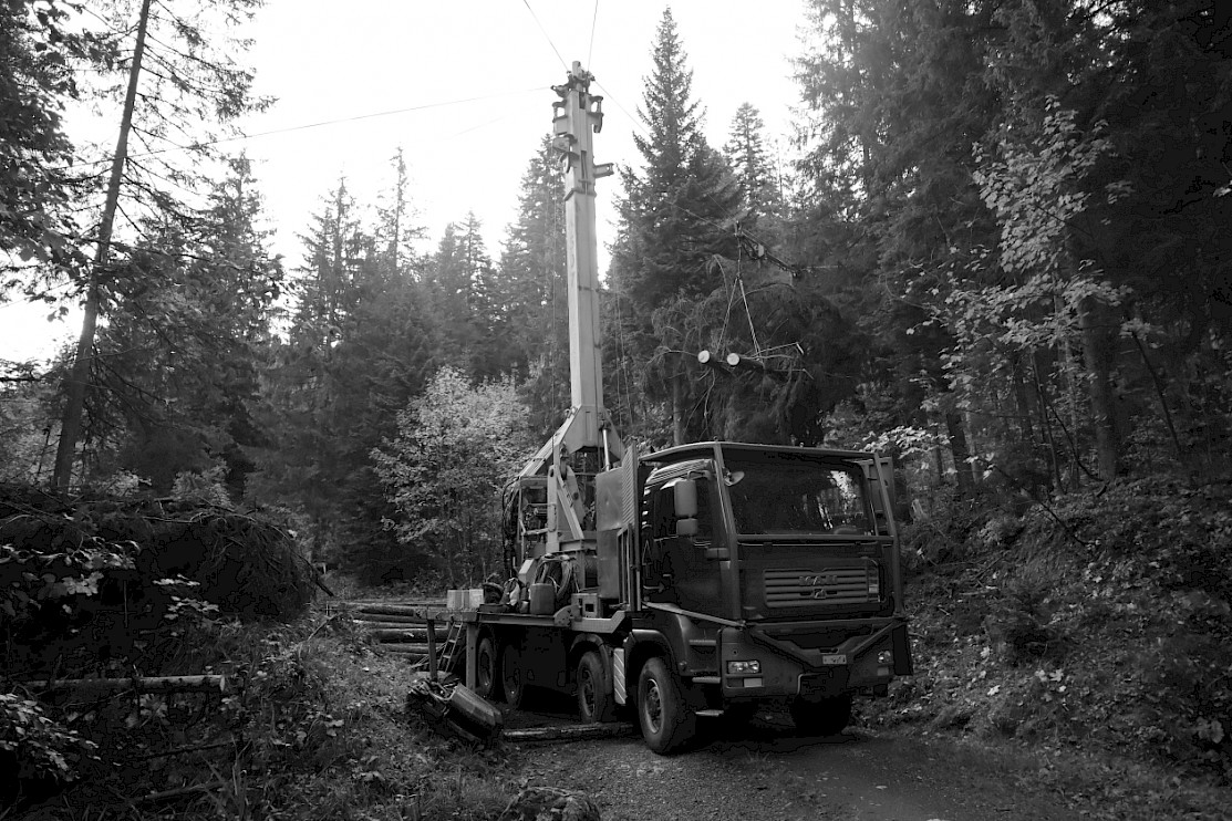 The cable corridor was 543 m long, of which only 490 m were drivable. Initially, it was planned with three intermediate supports, but another intermediate support had to be installed due to insufficient carriage height in the middle of the cable corridor. In total, approx. 75 m in altitude had to be overcome, resulting in a slope of less than on average 15%. The yarding direction was slightly downhill.
