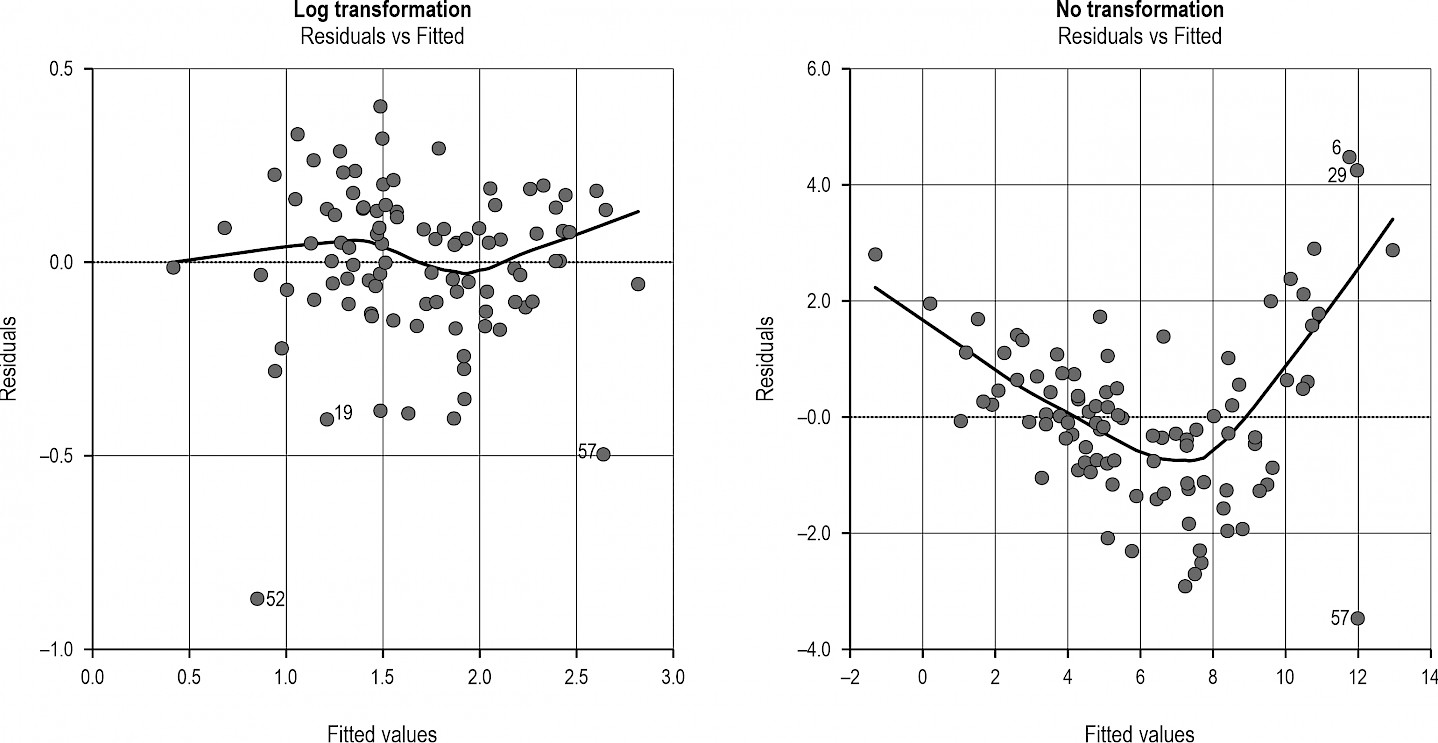 Fig. A1 Illustrative Tukey-Anscombe plots for models with (left) and without (right) a log-transformed response variable