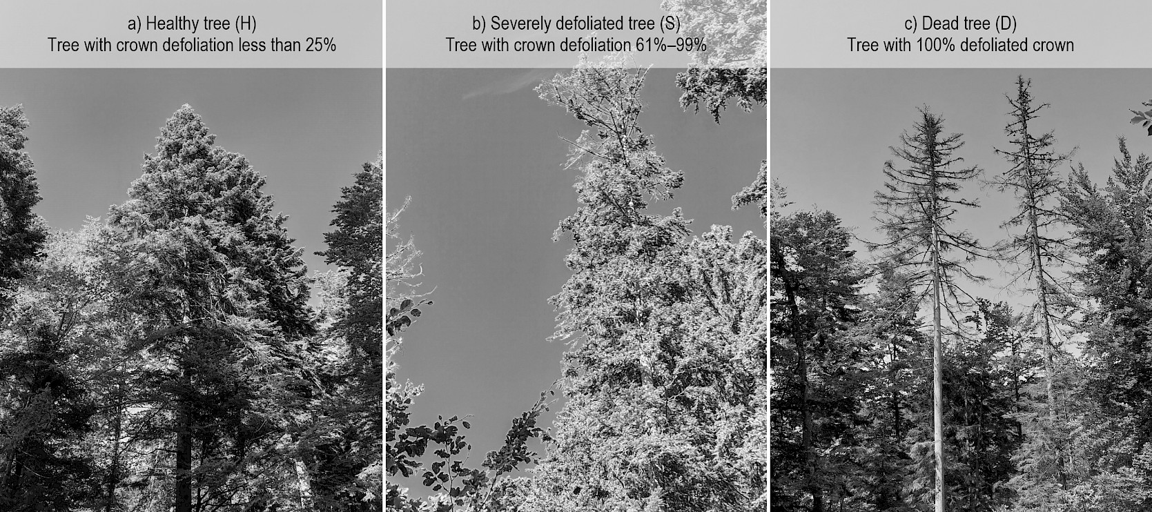 The tree crown defoliation degree is an often used indicator of tree health and vigor (Ferretti et al. 2021), and it is also used as an indicator of air contamination (Augustaitis et al. 2010). Overall, many studies were focused on the correlation between tree crown defoliation degree and different types of stressors (Popa et al. 2017), to improve mortality models (Paixo et al. 2019), and to improve growth rate models (Dobbertin and Brank 2001).