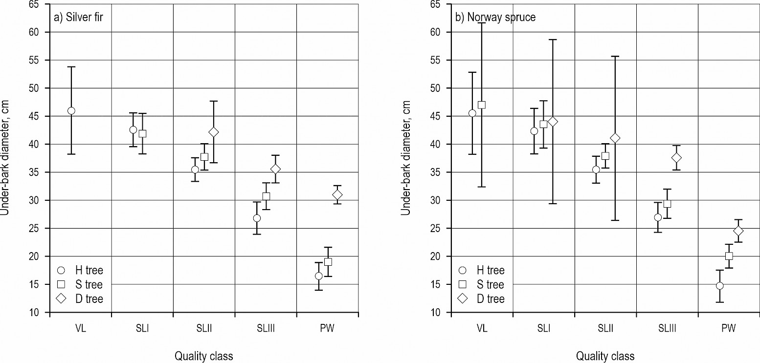 quantity and quality of produced silver fir and Norway spruce assortments from dieback-affected trees