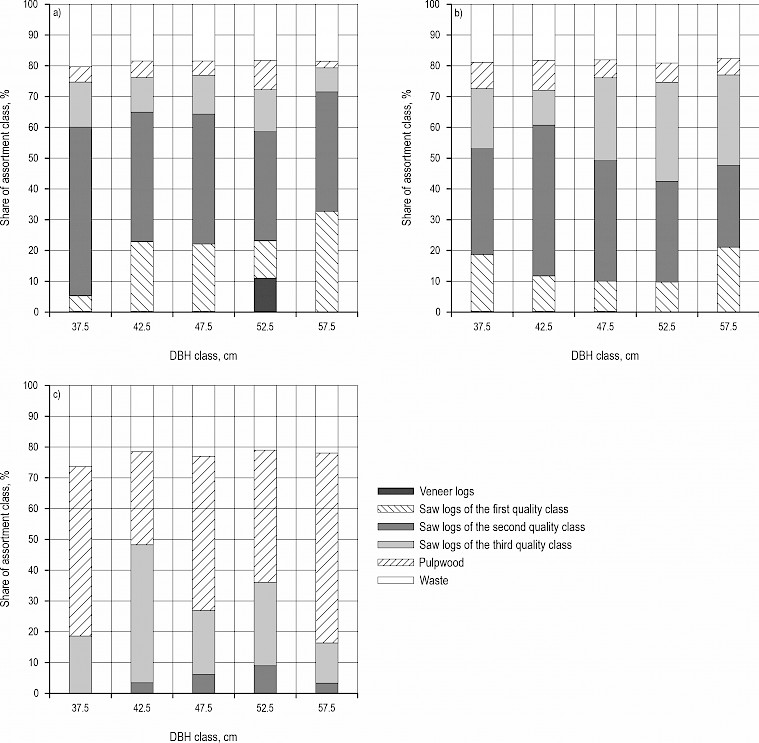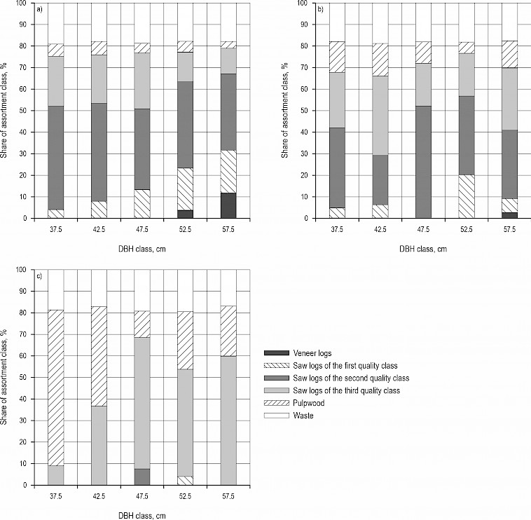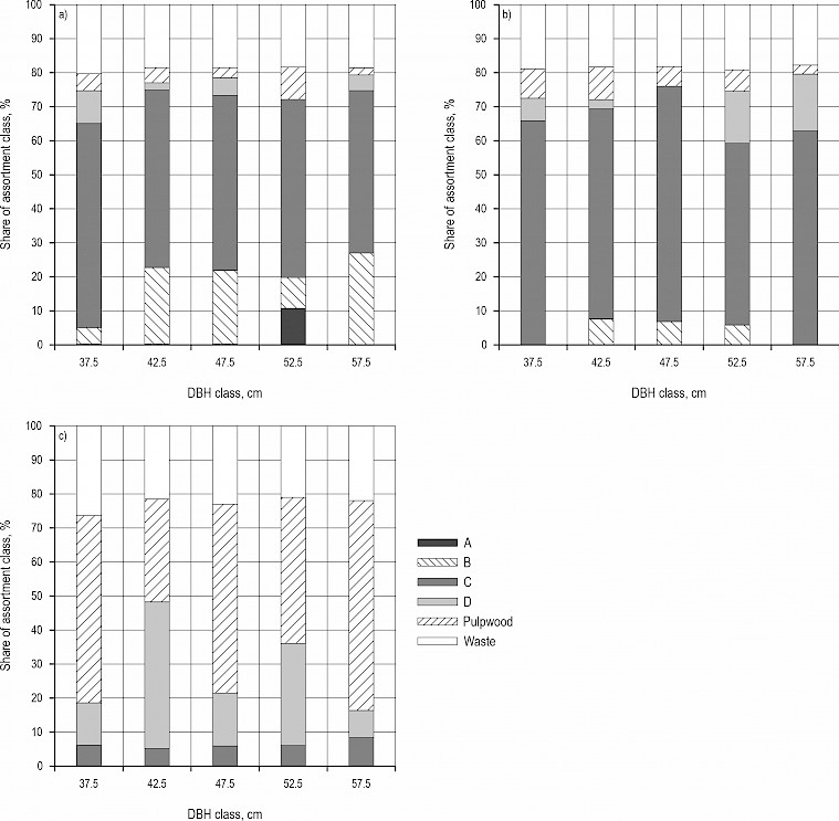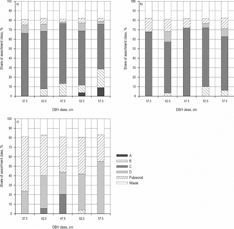 Fig. A2 Norway spruce assortment structure according to HRN EN grading classes: a) for healthy spruce trees, b) for severely defoliated spruce trees, c) for dead spruce trees